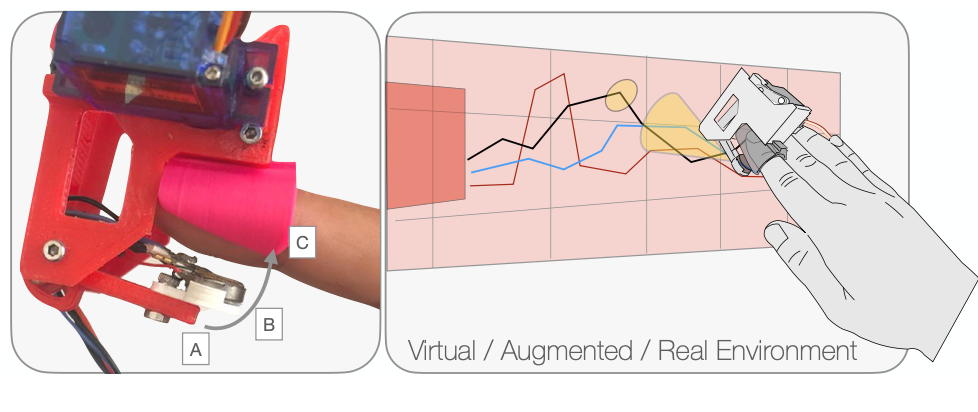 In this paper, we investigate whether cutaneous force-feedback can be used as a quantitative channel for visualization tasks. We propose Haptixel, a DIY self-contained encountered-type wearable device, providing force-feedback to its user’s fingertip pulp.